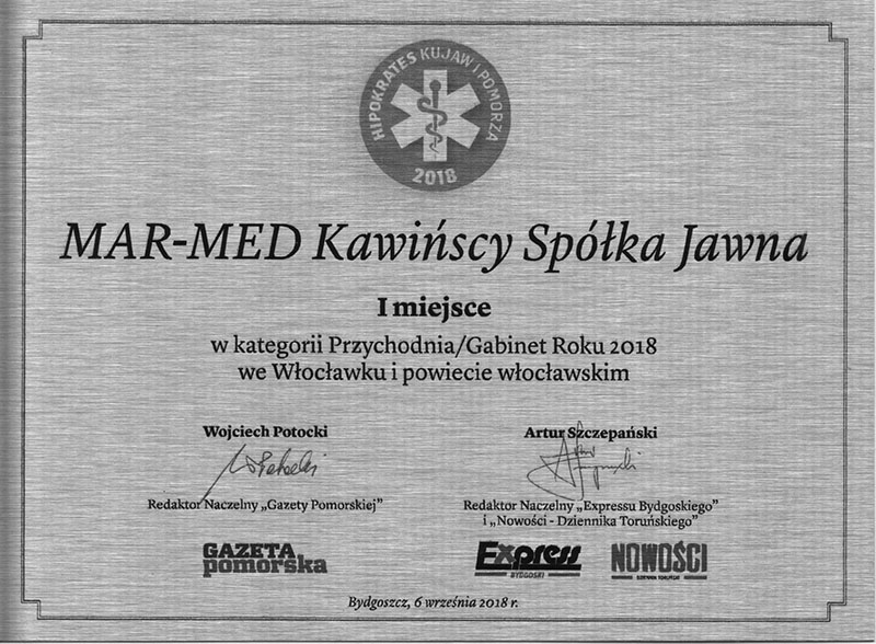 W roku 2018 nasza placówka została laureatem konkursu Hipokrates Pomorza i Kujaw zdobywając I miejsce w kategorii „ Przychodnia Roku 2018”